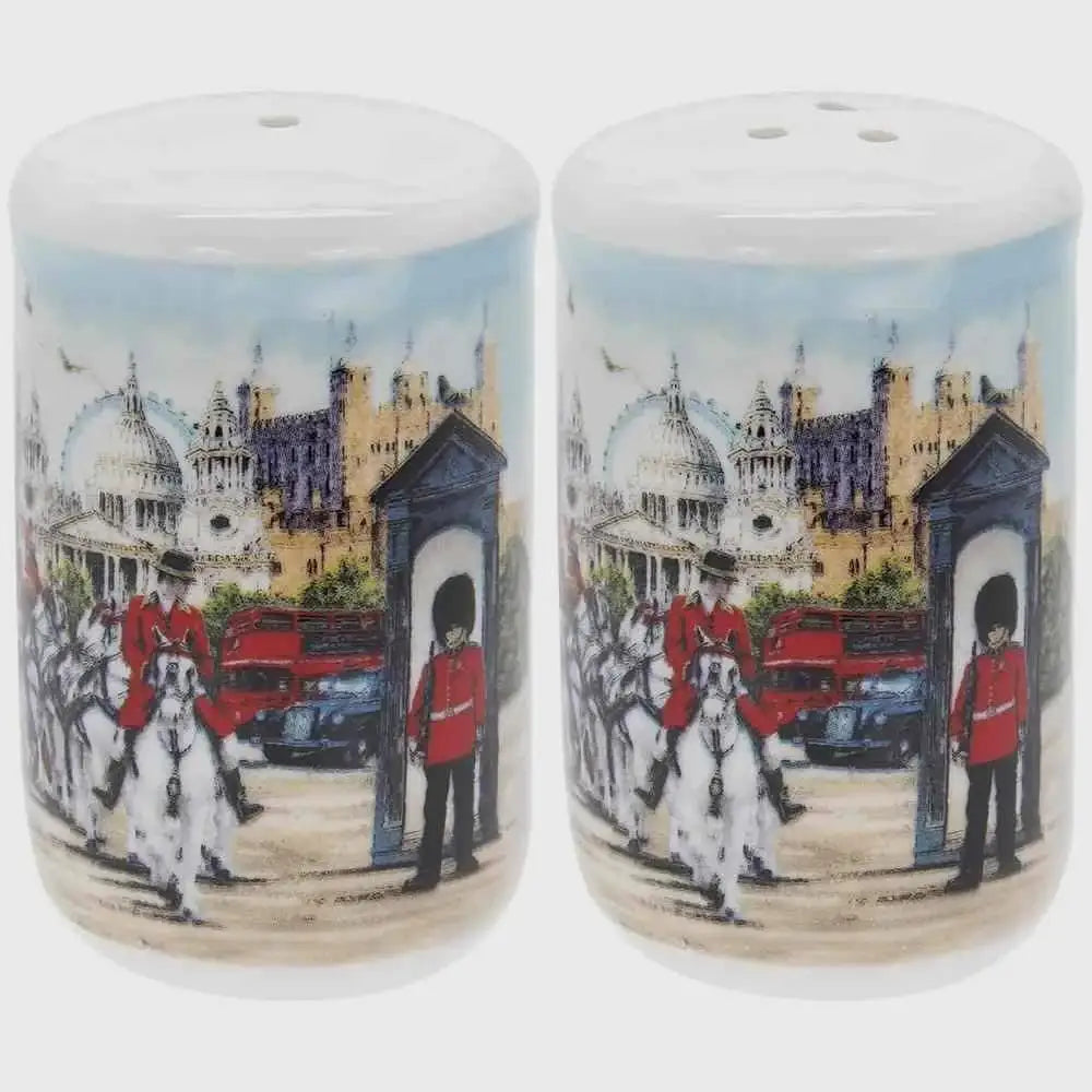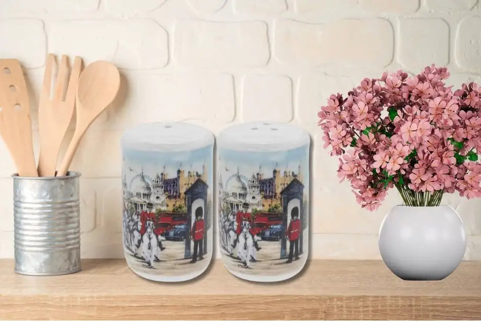 Our London Theme & Pageantry Salt & Pepper Shaker Cruet Set is a charming and whimsical addition to any dining table. This exquisite set captures the essence of Britain's rich history and pageantry. Crafted from fine china, each shaker depicts iconic London symbols, adding a touch of elegance and fun to your meals. This isn't just a functional kitchen item; it's a conversation starter, a piece of art, and a delightful reminder of the UK.